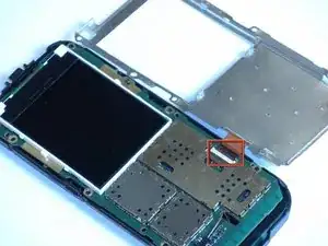 Найдите оранжевую ленту‑шлейф, соединяющую металлическую пластину дисплея с платой.