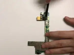 С помощью пинцета захватите клейкую ленту, находящуюся под LTE‑шлейфом, и потяните её наружу и в сторону нижнего края телефона.