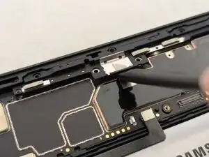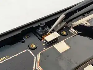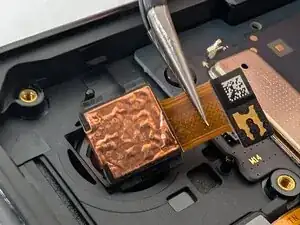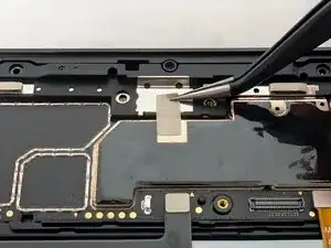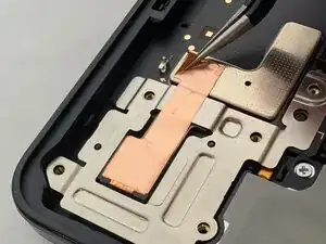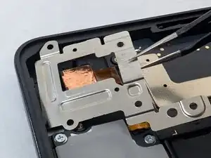 Используйте пинцет, чтобы удалить заднюю металлическую скобу камеры, расположенную в верхнем левом углу устройства.