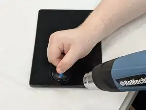 Используйте тепловую пушку, чтобы равномерно нагреть край устройства и ослабить клей, удерживающий экран на планшете.