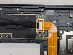 Осторожно поднимите экран к верхней части устройства (на сторону с передней камерой), следя за тем, чтобы не повредить оранжевый гибкий кабель.