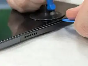 Используйте инструмент для всасывания, чтобы отделить экран от корпуса, и вставьте открыватель, чтобы помочь удержать край экрана отдельно от остальной части устройства.