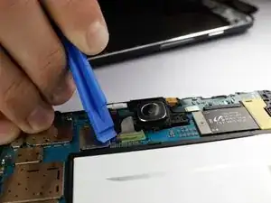 С помощью пластикового инструмента для поддёма отсоедините лентовый кабель камеры от материнской платы.