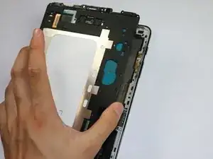 Убедитесь, что вы отделили весь клей под средней частью экрана, а также по краям — используйте тонкую жёсткую карточку, чтобы прорезать его. Избегайте лентового кабеля. Не пытайтесь поднимать экран, пока весь клей не будет отделён.