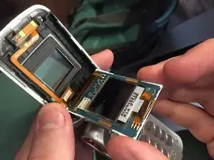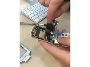 Снимите экран, воспользовавшись пальцами, и отключите гибкий кабель в нижнем правом углу с задней стороны экрана.