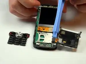 Вставьте пластиковый инструмент в отверстие и поверните его, чтобы получить рычаг. Это начнёт отделять переднюю панель от внутренней пластиковой опорной рамки.
