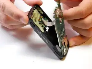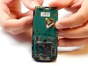Отведите нижнюю часть батареи от телефона большим пальцем и поверните до тех пор, пока отверстие внизу корпуса не будет направлено вниз. Батарея должна выскользнуть.