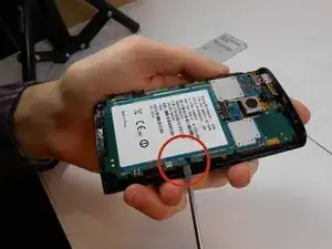 Используя инструмент для открытия корпуса, начните с правого нижнего угла телефона и отсоедините защелки, расположенные на внутренних сторонах. Повторите этот шаг для левой стороны.