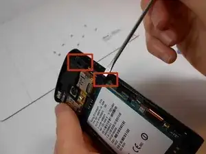 Чтобы удалить внутренний корпус вокруг камеры, примените давление на левую сторону внутреннего корпуса и, используя плоскую отвертку, отстегните обе защелки с правой стороны корпуса. После этого отсоедините шлейф с помощью плоской отвертки.
