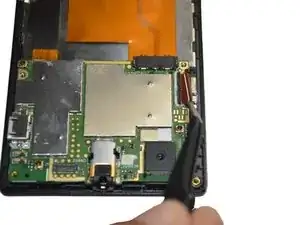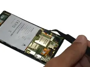 Найдите маленький держатель в нижнем левом углу телефона (при взгляде на него вверх ногами) и используйте инструмент для вскрытия, чтобы отжать заднюю крышку.
