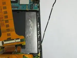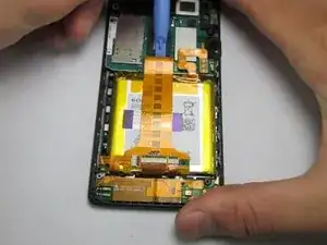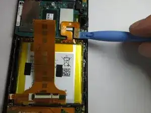 Используйте пластиковый инструмент для открытия, чтобы отсоединить шлейф, проходящий через батарею.