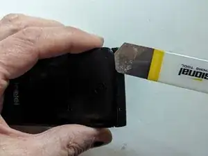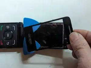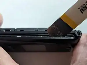 Начиная со стороны шарнира, вставьте металлический инструмент для вскрытия между задней крышкой и рамкой дисплея.