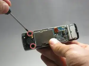 Снимите два винта 7,3 мм, крепящие камеру и динамик на нижней задней панели телефона, с помощью отвертки Phillips #00.