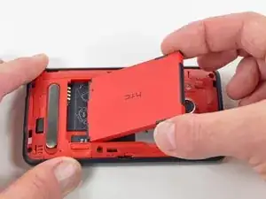 Используйте плоский конец лопатки, чтобы приподнять красный фиксатор MicroSD, прикрепленный к внутренней рамке.