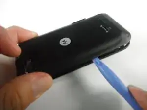 Вставьте пластиковый инструмент для открытия между задней крышкой и корпусом телефона в отверстие, отмеченное стрелкой.