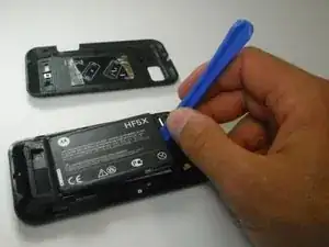 Вставьте инструмент для открытия между аккумулятором и держателем аккумулятора и выньте аккумулятор.
