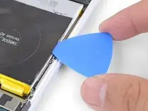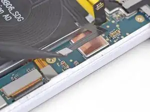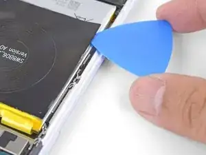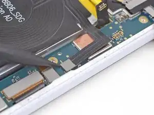 Используйте наконечник лопатки, чтобы приподнять и отсоединить разъём катушки беспроводной зарядки от материнской платы рядом с правым краем телефона.