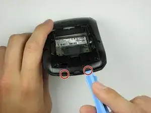 Используйте пластиковый инструмент для вскрытия, чтобы надавить на два защелкивающихся фиксатора, расположенных в нижней части телефона.