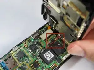 Аккуратно возьмитесь за один из углов материнской платы и просто поднимите ее прямо вверх из корпуса телефона.