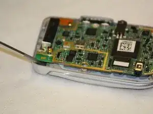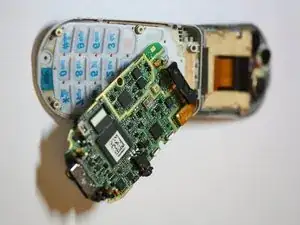 Плата удерживается только 4 защёлками и шлейфом дисплея в правом верхнем углу. Просто подденьте одну сторону отверткой, чтобы отщелкнуть плату, прежде чем отсоединять шлейф дисплея.