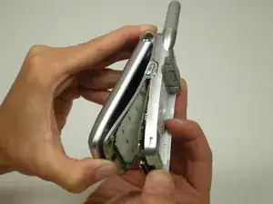 Разблокировав кнопку, возьмитесь за аккумулятор за боковые стороны и потяните вверх, затем прокSlideте аккумулятор вверх, чтобы полностью удалить его из телефона.
