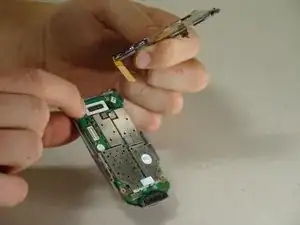 Найдите коричневый разъем, идущий от верхней части телефона к плате под клавиатурой.