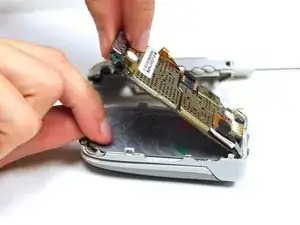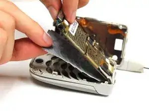 Осторожно приподнимите край печатной платы, наиболее удалённый от шарнира телефона.