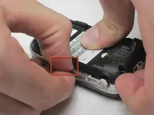 Используя подушечку большого пальца и ноготь, захватите аккумулятор в области, помеченной надписью «потяните здесь», и начните поднимать его вверх с этой стороны.