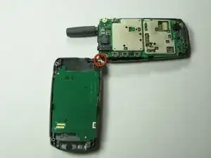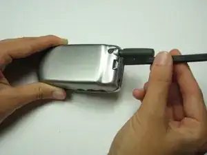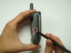 Используя палец или лопатку, нажмите на кнопку, расположенную в верхней части телефона рядом с антенной.
