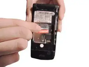 Нажмите на серебристую защёлку, расположенную в верхней центральной части задней панели телефона Motorola W490.