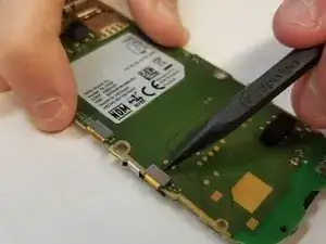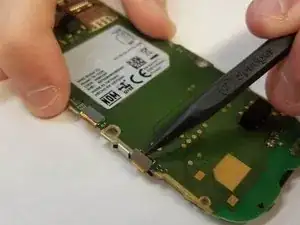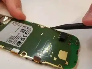 На белой рамке телефона есть выемка в верхнем правом углу батареи. Используя палец или пластиковый инструмент, воспользуйтесь выемкой, чтобы поднять батарею и удалить её из устройства.