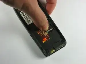 Нажмите и удерживайте кнопку фиксации аккумулятора и сдвиньте аккумулятор в сторону от логотипа Nokia.