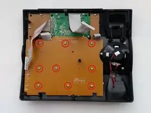 Удалите девять винтов размером 11 мм с платы с помощью отвертки Phillips #00, чтобы получить доступ к датчикам давления клавиатуры.