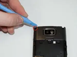 Используя пластиковый инструмент для поддевания, снимите крышку винта в верхнем левом углу телефона, поддев её вверх.