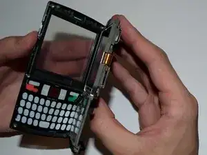 Будьте внимательны и не пытайтесь снять переднюю панель. Она всё ещё соединена с корпусом телефона ленточным кабелем, расположенным в нижнем правом углу материнской платы.