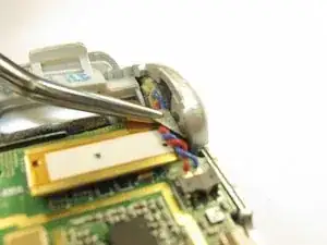 Используйте пинцет, чтобы отогнуть наклейку на задней стороне динамика, чтобы открыть винт, который удерживает динамик на месте.