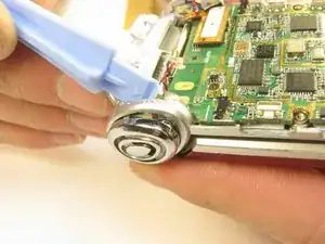 Используйте пластиковый инструмент для того, чтобы поддеть материнскую плату от корпуса телефона на язычках с обеих сторон телефона в показанном месте. Может потребоваться усилие.