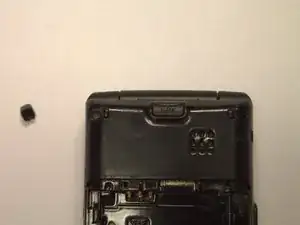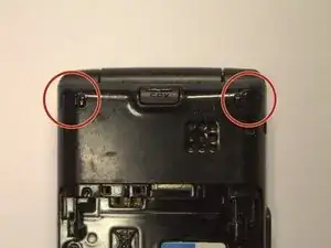 С помощью лопатки или другого острого инструмента снимите два резиновых элемента в верхней части задней панели телефона.