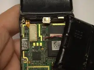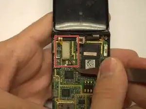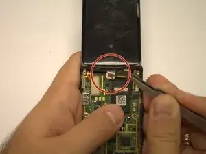 Найдите маленький язычок в верхней центральной части материнской платы. Он соединяет материнскую плату с остальной частью телефона. Отсоедините его с помощью пинцета.