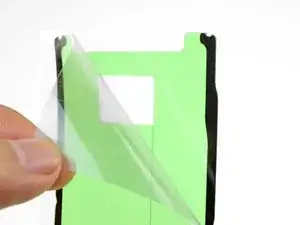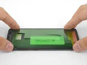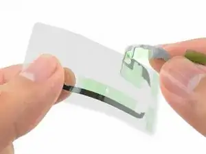 Снимите и удалите зеленую пластиковую защиту со всех клеевых полосок, чтобы открыть клеевую сторону, обращенную к экрану.