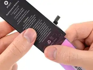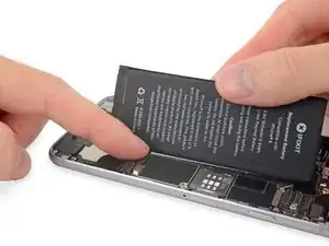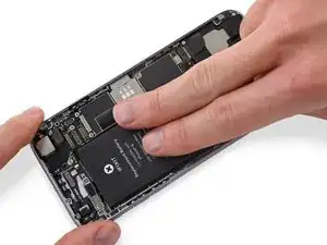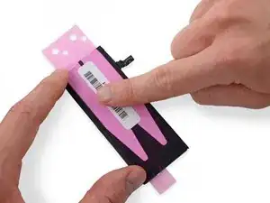 Когда аккумулятор правильно расположен, уложите его в iPhone и плотно прижмите, чтобы клейкие ленты приклеились к задней части корпуса.