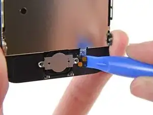 Используйте пластиковую лопатку, чтобы поддеть край ленточного кабеля кнопки «Домой» и отсоединить его от сборки дисплея.