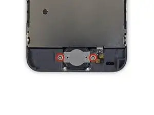 Выкрутите два винта Phillips #000 длиной 1,3 мм, крепящих скобу кнопки «Домой» к сборке дисплея.