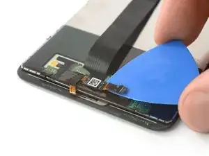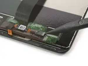 Используйте лопатку, чтобы приподнять и отключить разъем гибкого кабеля дисплея и отвести кабель дисплея в сторону, чтобы удалить аккумулятор.