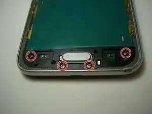 Отверткой с насадкой Phillips #0 открутите четыре винта из чёрного пластикового элемента вокруг кнопки «Домой».
