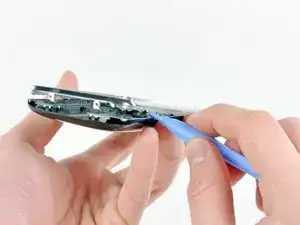 Проведите краем инструмента вдоль шва, чтобы отделить два компонента. Цель состоит в том, чтобы приподнять серебряную рамку достаточно, чтобы протолкнуть кнопку громкости внутрь заднего корпуса.