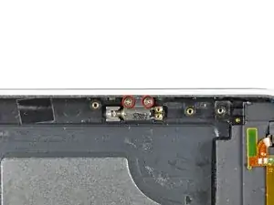 Удалите два винта Phillips #00, закрепляющих кнопку включения/выключения на передней рамке.