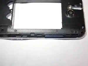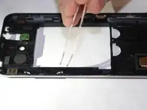 Используя пинцет, извлеките кнопку громкости, отсоединив два белых фиксатора, удерживающих её на месте.