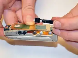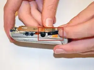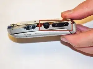 Когда задняя крышка полностью удалена и убрана в сторону, используйте пальцы, чтобы снять кнопку громкости.