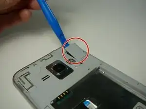 Найдите область с углублением, выделенную красным, и используйте ноготь или инструмент для поддевания (например, пластиковую карту), чтобы отделить заднюю панель от корпуса телефона.